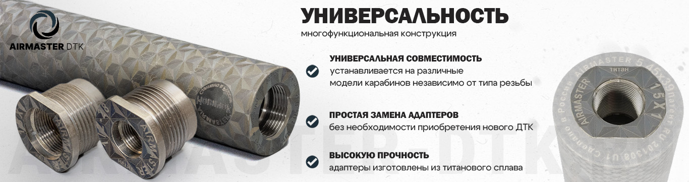 Штатная внутренняя резьба 24×1,5 позволяет использовать ДТК на разных карабинах — достаточно сменить титановый адаптер под нужную резьбу ствола.